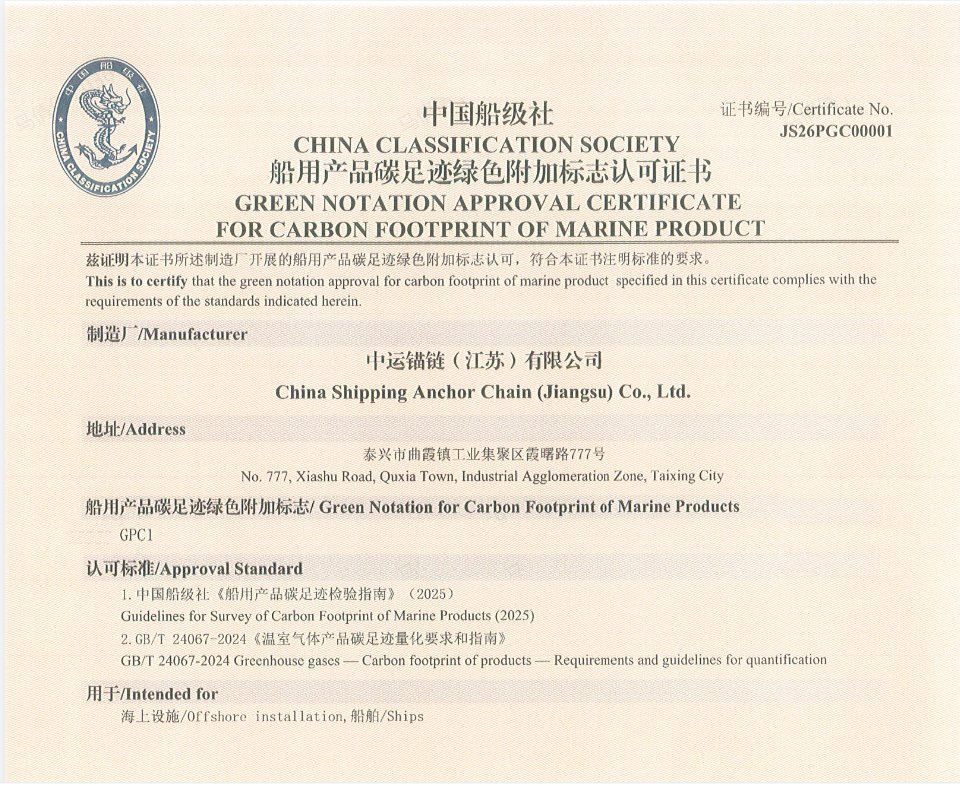 As the first marine anchor chain and offshore mooring chain manufacturer in China to obtain such certification, CSAC has achieved a leap from traditional manufacturing advantages to green and low-carbon value advantages.